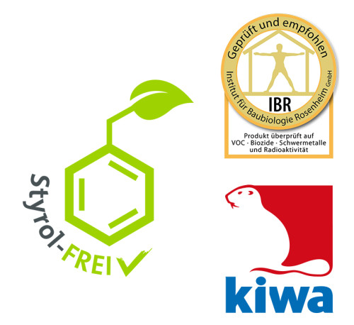 • zertifizierter baubiologischer Werkstoff, der die strengen Prüfkriterien des Instituts für Baubiologie Rosenheim (IBR) bezüglich Schwermetallen, VOC’s, Biozide und Radioaktivität erfüllt, styrolfrei
